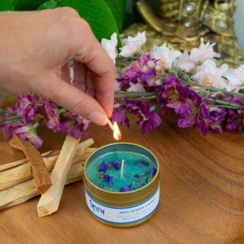Een hoge kwaliteit edelsteen spell geurkaars in een blikje. De combinatie van de geur en de edelsteentjes Bergkristal en Lapis Lazuli staan symbool voor Anti-Stress.
